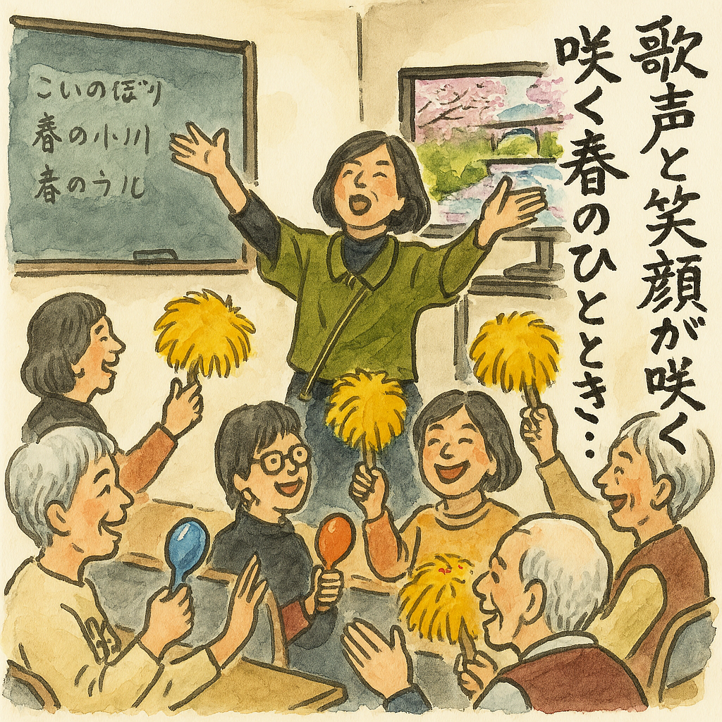 団地の歌の集いのスナップ写真 から絵手紙を描きました。