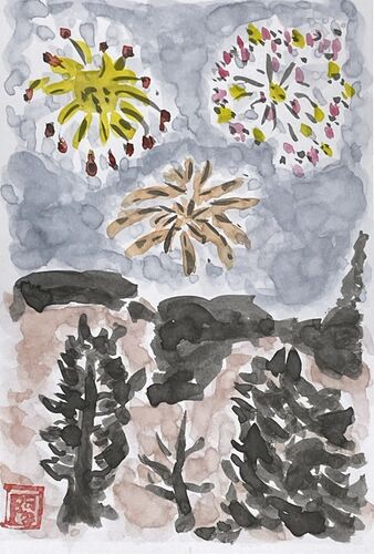 近くの中学校のグラウンドで、花火打ち上げがありました。 夕方の10分間ほどですが、 ベランダからも見えて、楽しい時間でした。 CoPilot先生に、絵手紙風に描いてもらいました。 私も絵手紙花火を描いてみました。